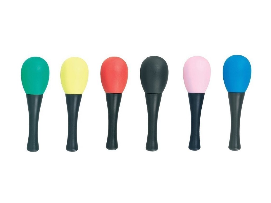 Černá rukojeť. 6 různých barev samotného shakeru, každá s jinou gramáží chrastící náplně:
