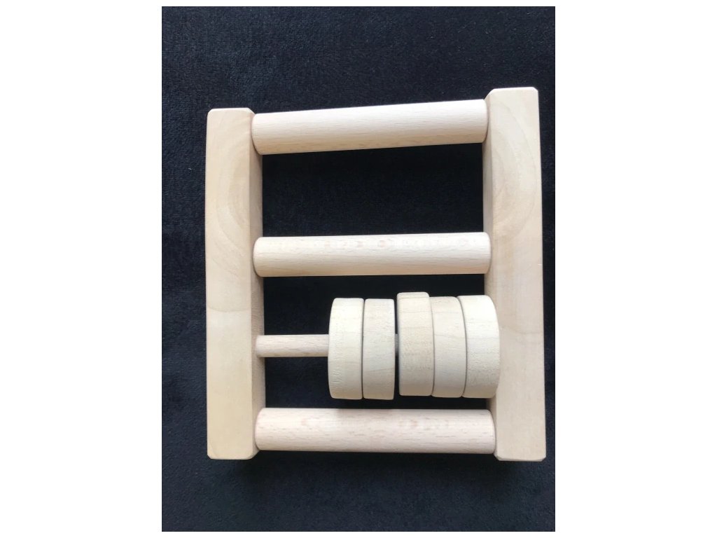 Rytmický nástroj ze dřeva. Stačí uchopit a zahrkat dřevěnými kolečky. Vhodné pro děti. Dobře se drží díky rámovému tvaru.