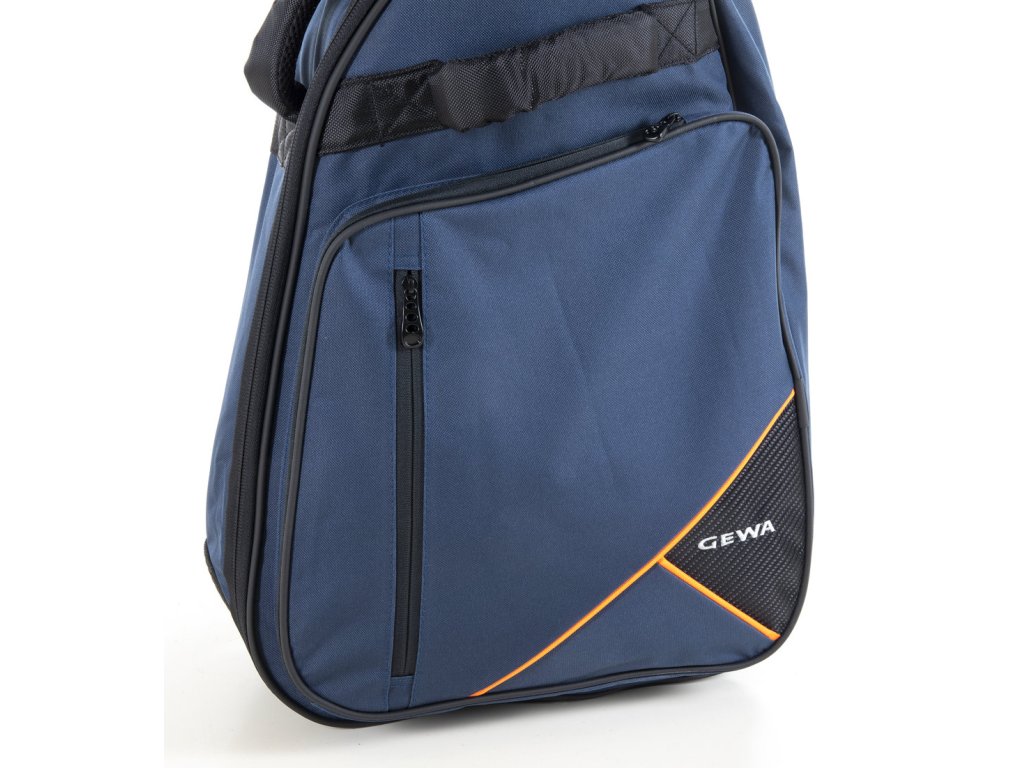Barva modrá, černé obšití a zipy, černá poutka, doplněno oranžovými pruhy a oranžovým štítkem Gewa.