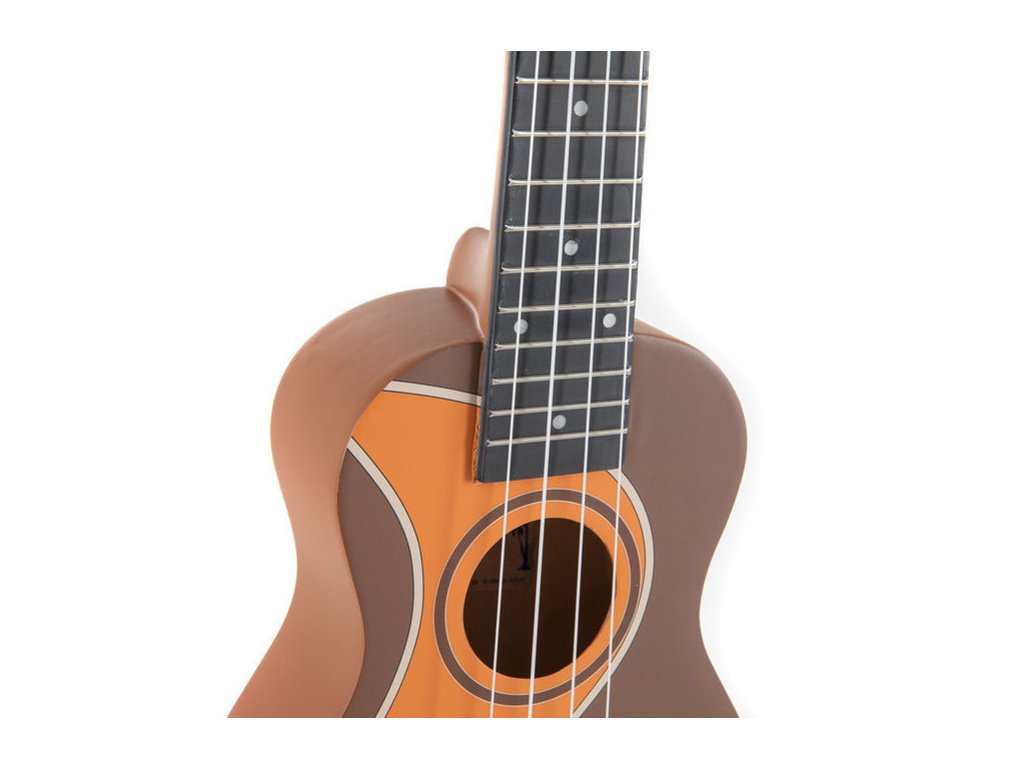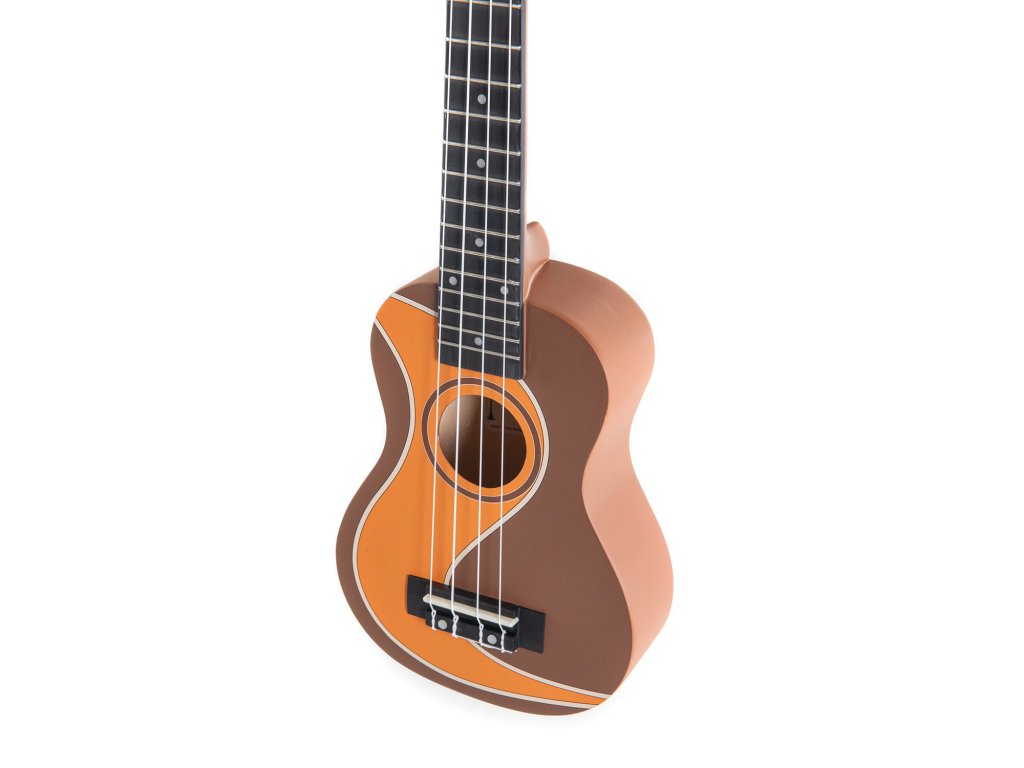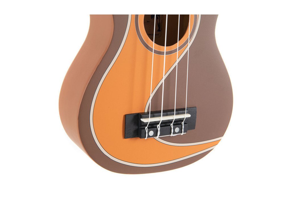 Tento kousek má tělo ve středně hnědé barvě a v přední části oranžové vlny. Menzura strun 344 mm, a 16 pražců. Hmatník i kobylka pěkně kontrastuje s barvou celého ukulele.