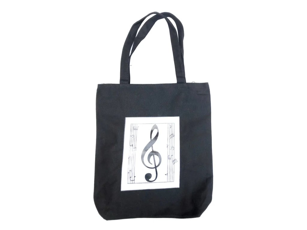 Taška na noty z pevného textilního materiálu černé barvy. Na vnější straně je v bílém poli zobrazen velký houslový klíč a kolem něj dvě notové osnovy. Taška je vhodná na klasické nošení v ruce, má dvě ucha a zapínání na zip. Uvnitř je malá kapsička na drobnosti také na zip. Do tašky pohodlně naskládáte např. několikatery noty, zpěvníky nebo menší hudební nástroje.