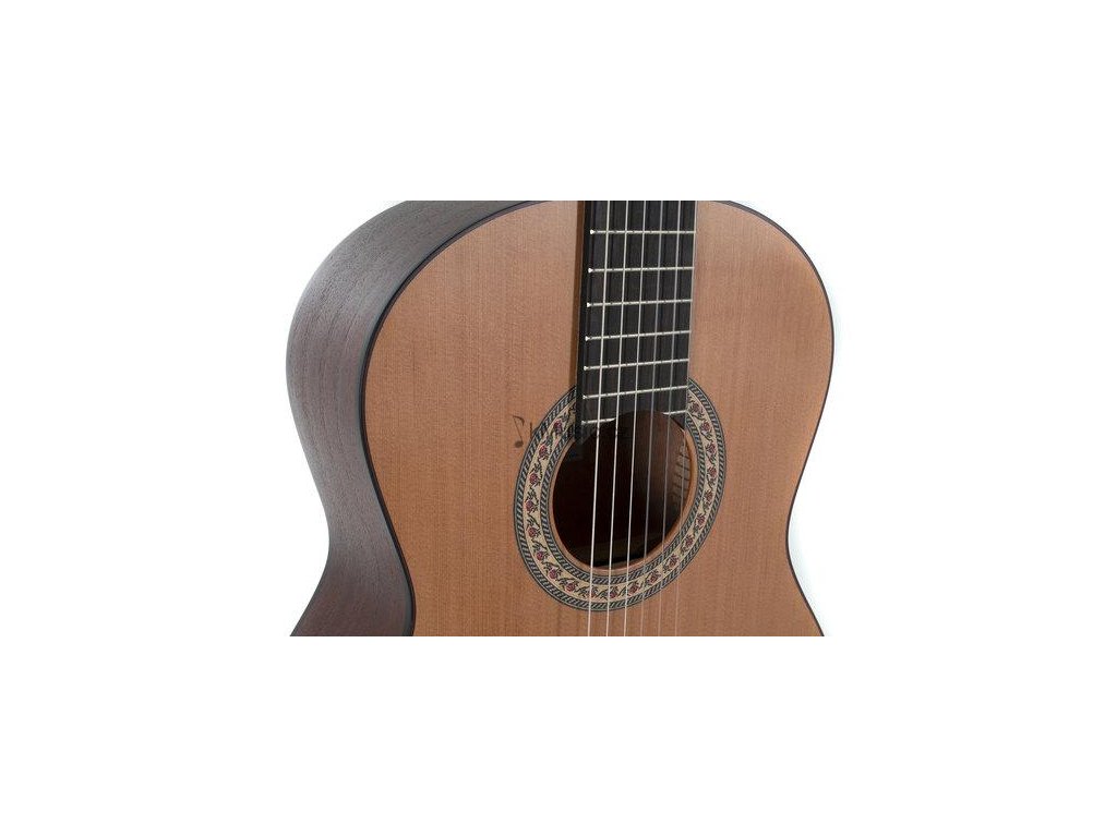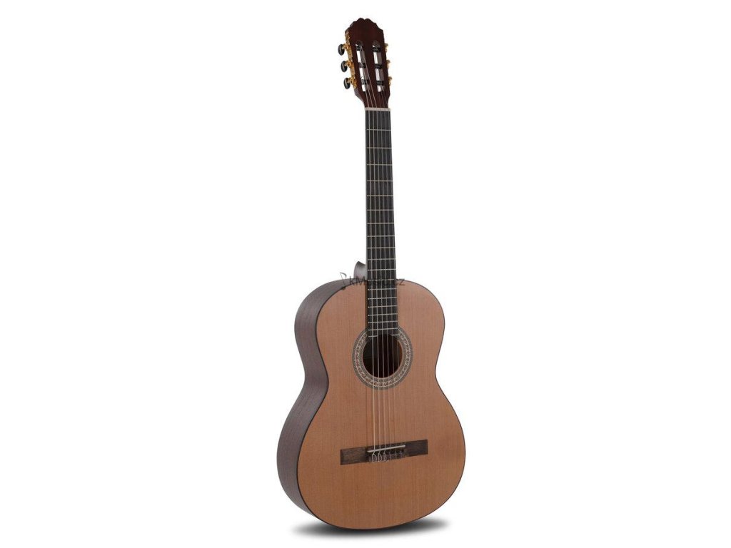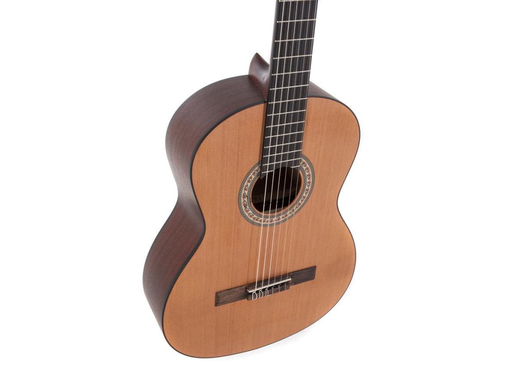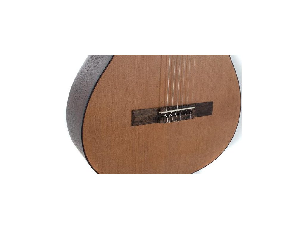 Klasická kytara 7/8 s masivní cedrovou horní deskou, originál strunami Hannabach a karbonovou výstuží krku. Ideální kytara například pro ženy nebo kytarysty s menší dlaní. Krásné barevné provedení, matné lakování a mozaiky kolem rezonančního otvoru. Kytara má krásný a jasný tón.