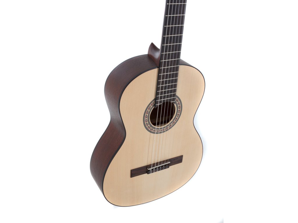Klasická kytara standartního designu. Masivní smrková horní deska, originál struny Hannabach, výztuha krku. ABS lem spodní i horní desky, mozajky kolem rezonančního otvoru.