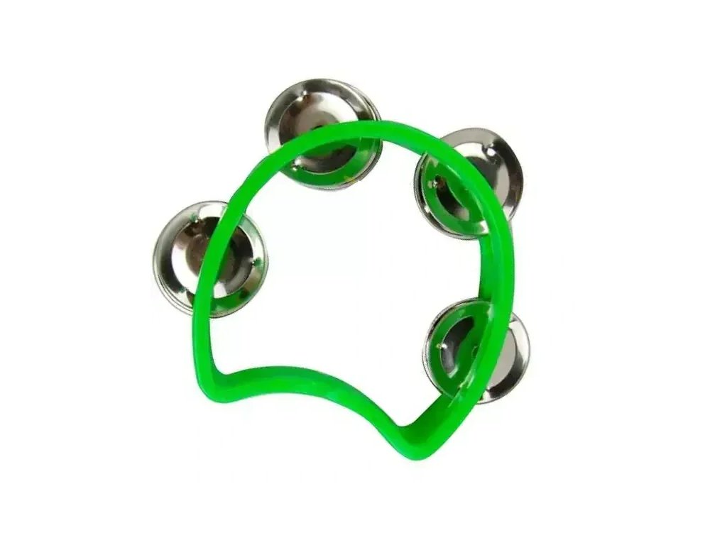 Plastová tamburínka pro děti se čtyřmi páry činelků. Tamburína má tvar půlměsíce, příjemnou zelenou barvu a dětem se pohodlně drží. Tamburínka může být jedním z prvních rytmických nástrojů pro menší děti. Je lehká a zvučná.