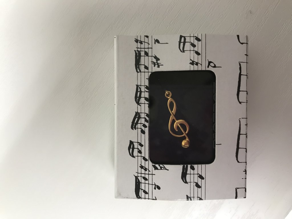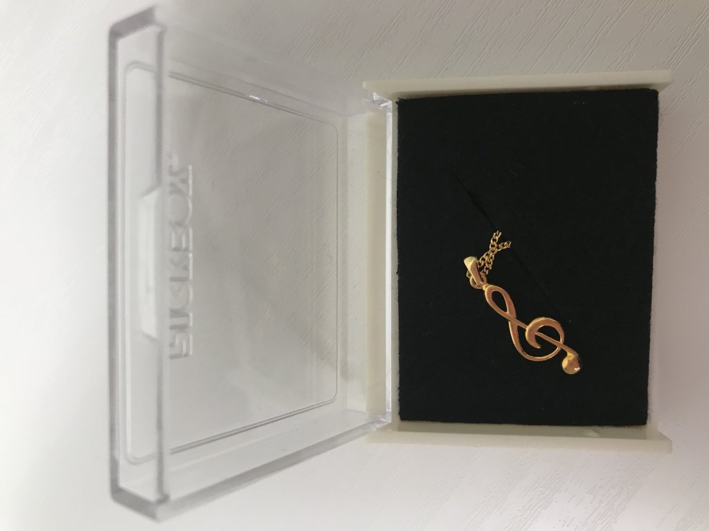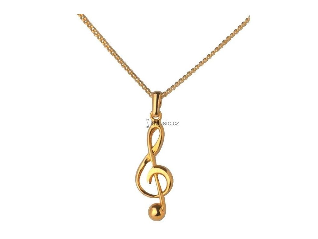 Přívěsek zlaté barvy ve tvaru houslového klíče určitě potěší každého milovníka hudby. Přívěsek na řetízku je balen v pěkné dárkové krabičce – plastová krabička s černým polštářkem a průhledným víčkem, navíc hezký papírový přebal s motivem not.