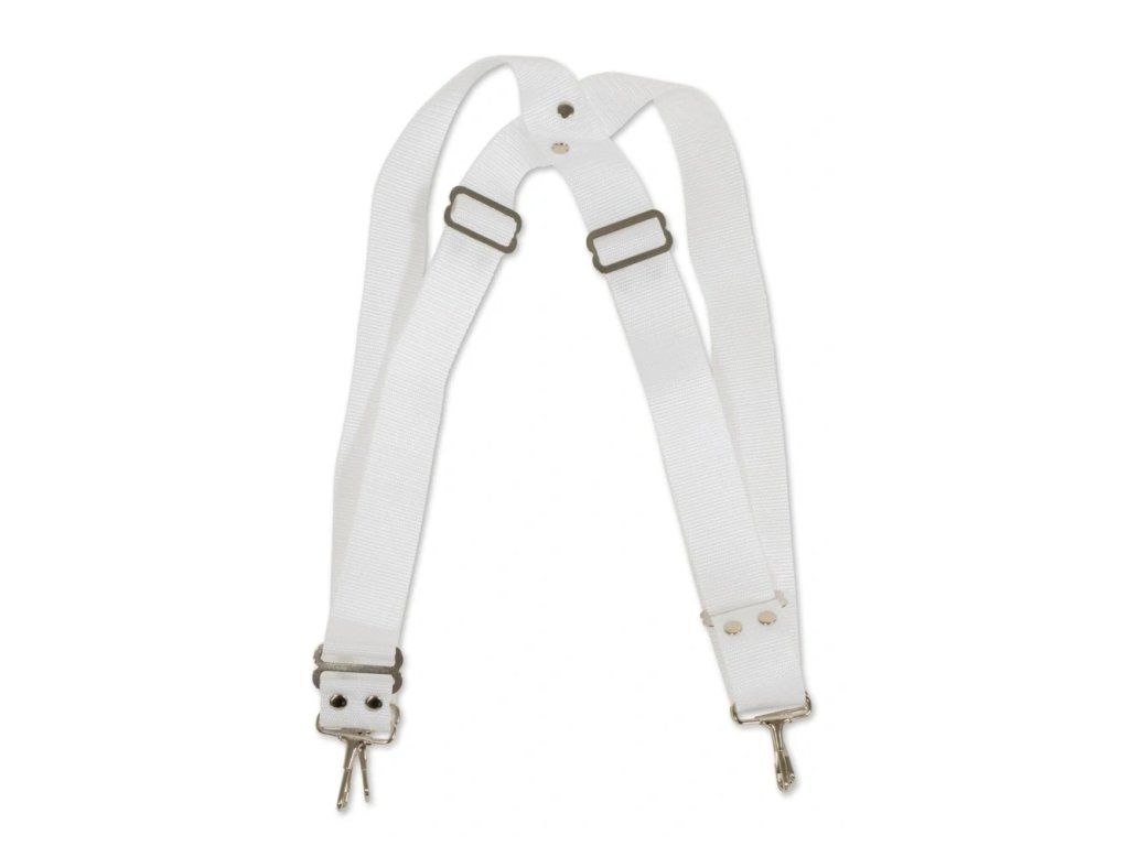 Bílé nylonové popruhy na záda pro Bass Drum (pochodový buben) ve tvaru kříže. Snadno stavitelná délka, rychlé nasazení na ramena. Uchycení k bubnu pomocí kovových karabin šířka popruhu 5 cm.