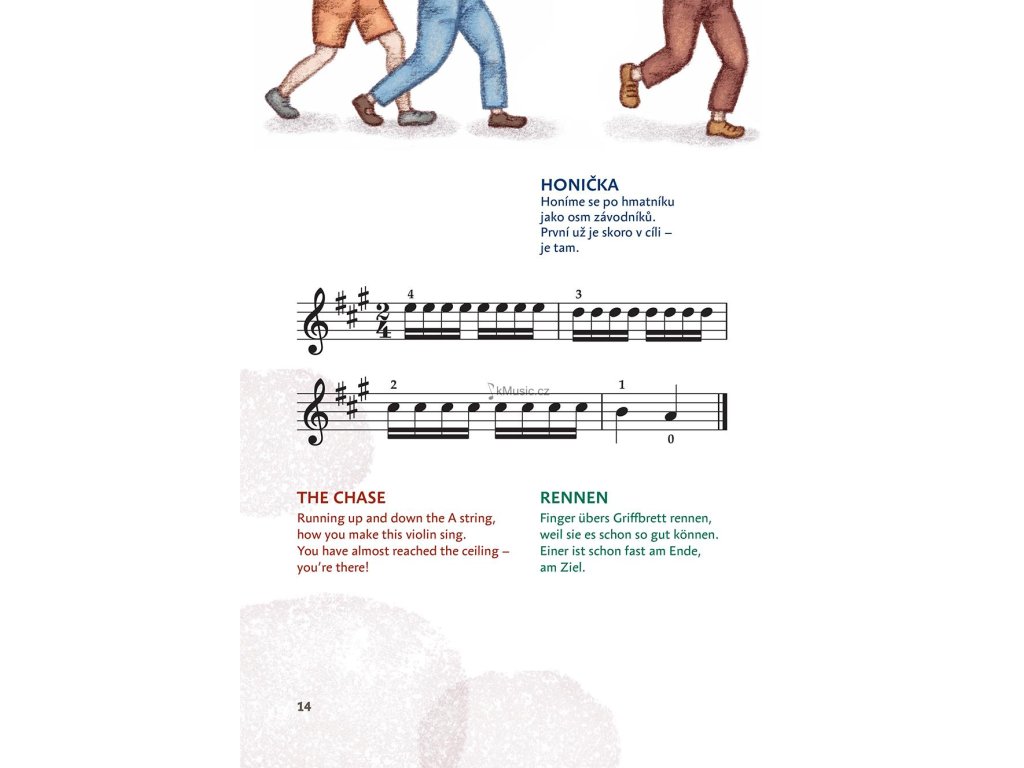 První skladbičky pro začínající hráče na housle doplněné říkadly a krásnými barevnými ilustracemi, slouží k procvičování durového prstokladu v první poloze. Text usnadňuje zvládnutí rytmu a dělá hraní zábavnějším. Publikace je určená dětem ve věku kolem 5 let. Tomu odpovídá i notový zápis ve velké notové osnově s velkými notami, což je pro malé děti čitelnější. Písničky jsou řazeny zhruba podle obtížnosti, v závěru jsou uvedeny ty nejtěžší, kde je již zapotřebí hry legato.