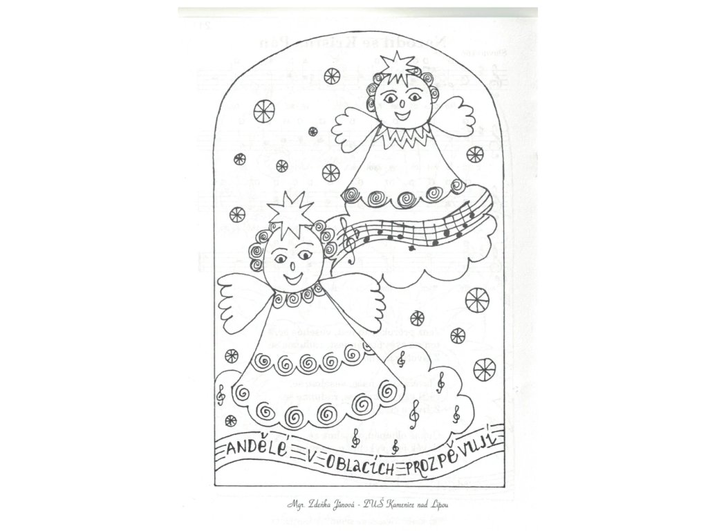 Na levé straně je vždy pěkná vymalovánka a na straně pravé notový záznam (i pro druhý hlas) s akordy a kompletním textem koledy.